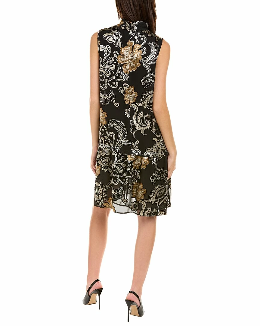 - Abbie Dress in black multicolor with velvet design, tie neck, dual side on-seam pockets, and shirred hem