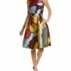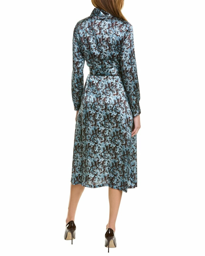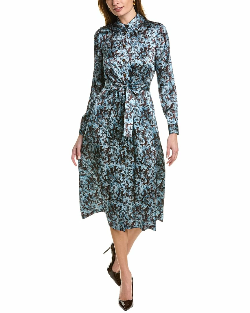 - Adair Silk Shirtdress in smoked slate multi with spread collar, button cuffs, and self-tie sash at waist