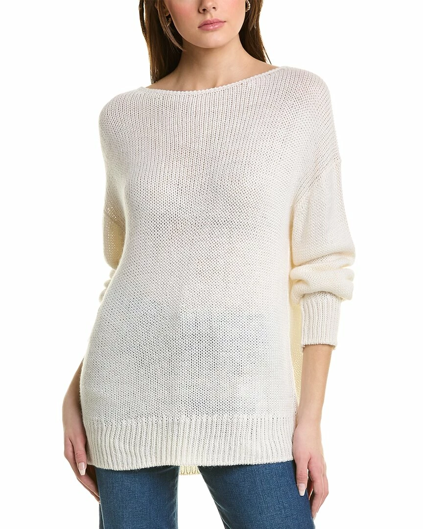 - Alpaca & Silk-Blend Sweater in cloud with bateau neck, dropped-shoulder sleeves, and ribbed trim