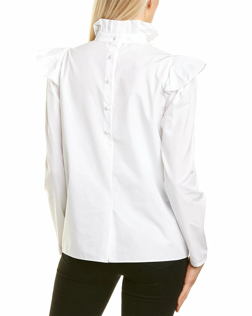 - Ashlyn Blouse in white with ruffled mock collar, Chevron ruffled bib, and button cuffs