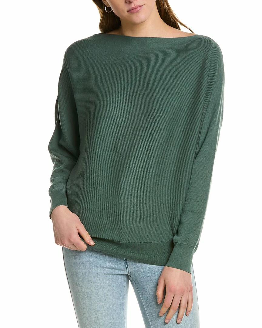 - Asymmetric Silk-Blend Sweater in green with scoop neck, batwing sleeves, and ribbed knit design
