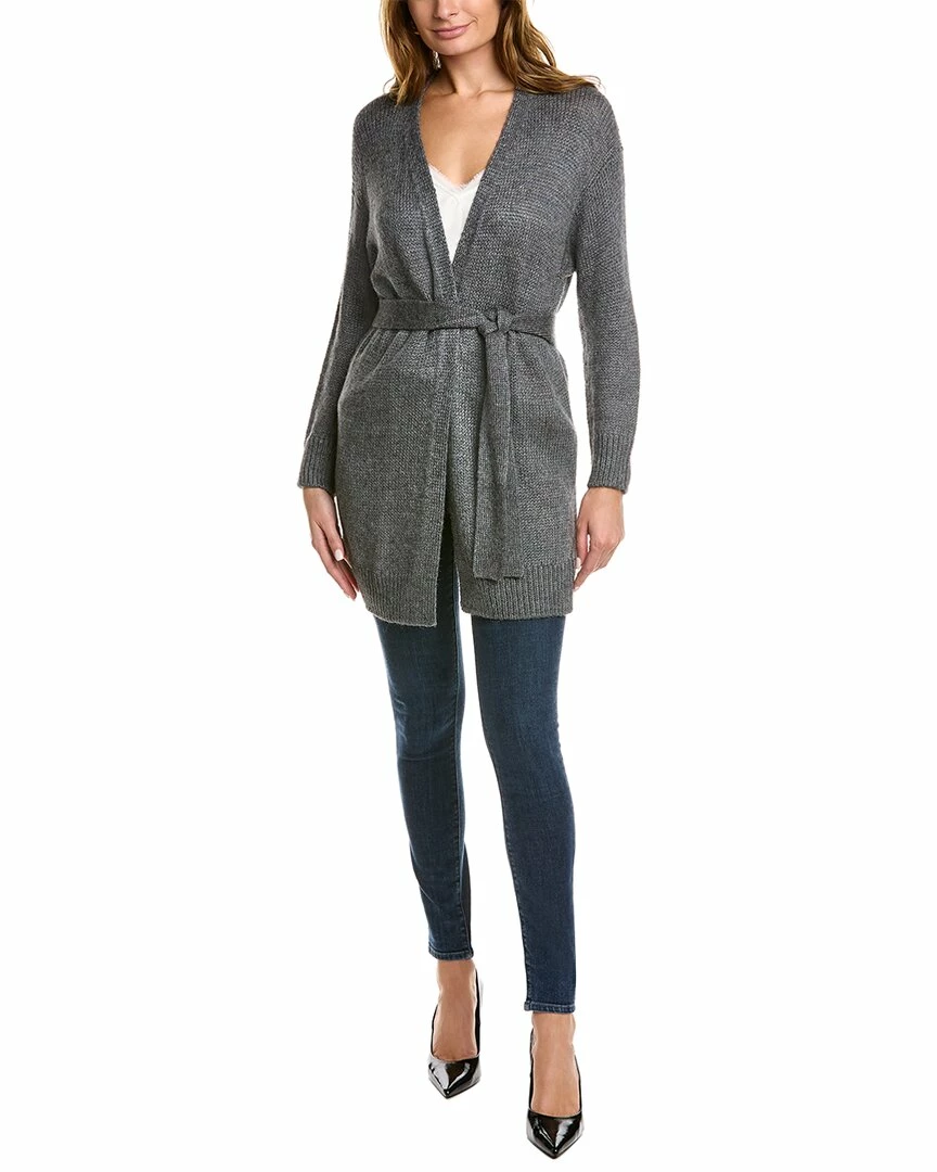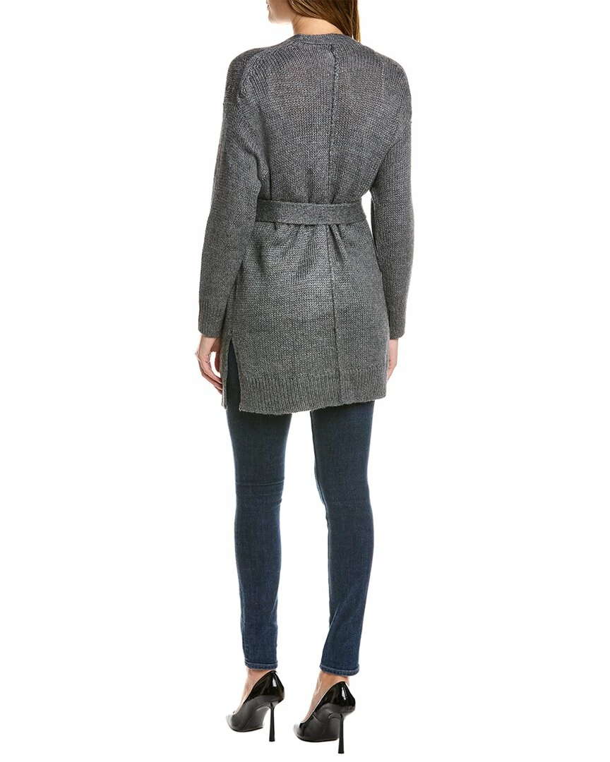 - Belted Alpaca & Silk-Blend Cardigan in nickel mélange with dropped-shoulder sleeves, ribbed trim, side slits at seams, and sash at waist