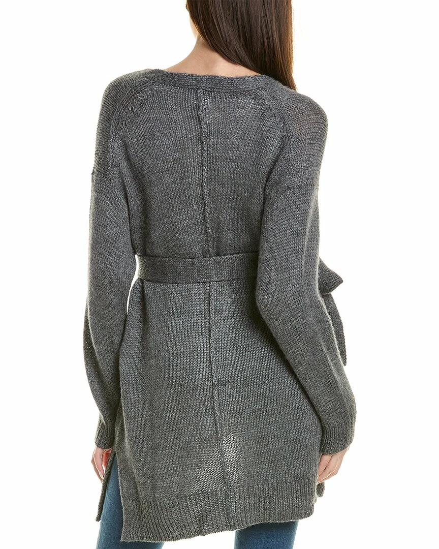 - Belted Alpaca & Silk-Blend Cardigan in nickel melange with dropped-shoulder sleeves, side slits at seams, ribbed trim, and self-tie sash at waist