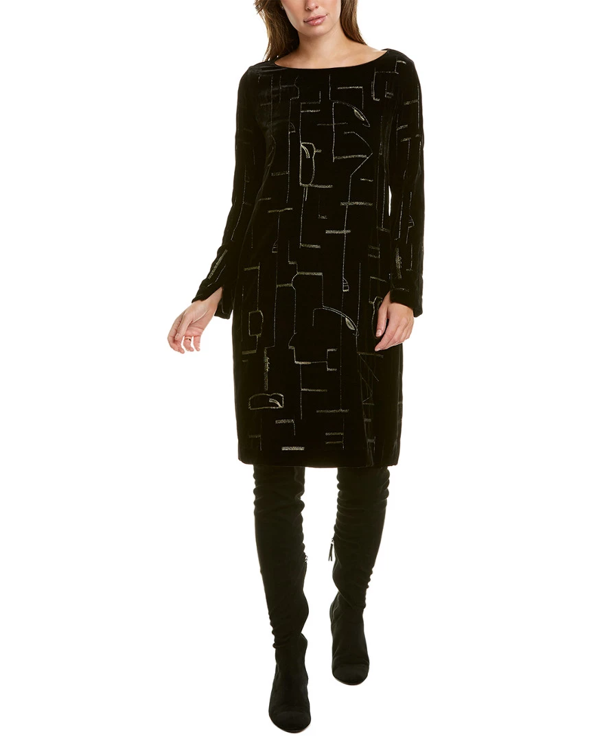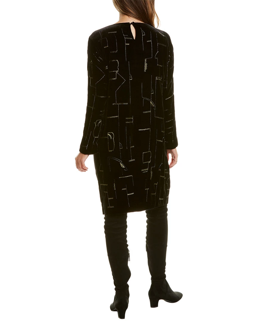 - Cressida Silk-Blend Shift Dress in black with embroidered velvet design, zippered cuffs, and two front pockets