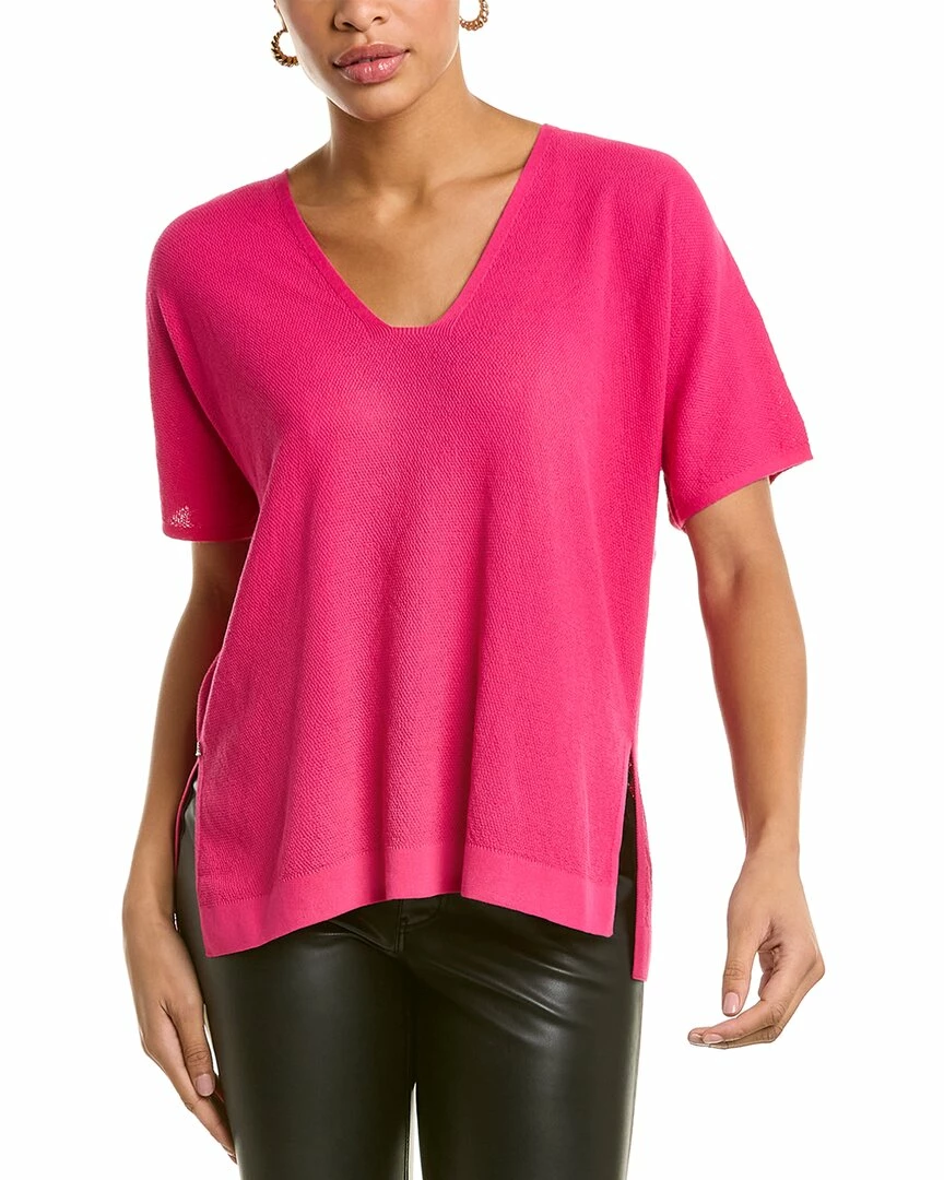 - Dolman Sweater in orchid pink with V-neck, dolman sleeves, step hem, and side slits at seams