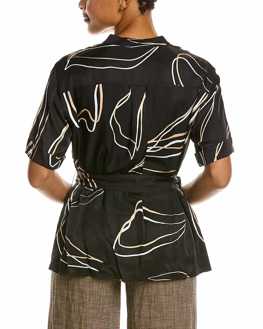 - Garden Contour Shirt in black multicolor with mandarin collar, rolled cuffs, and belted waist