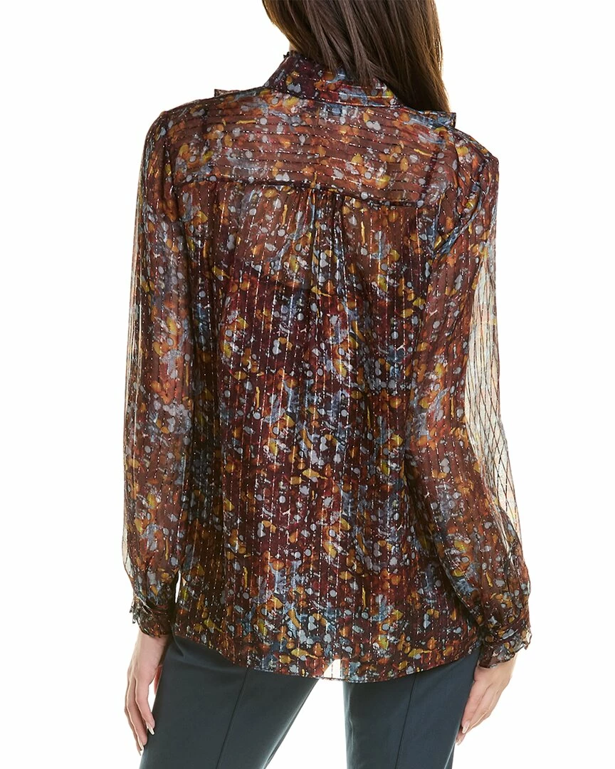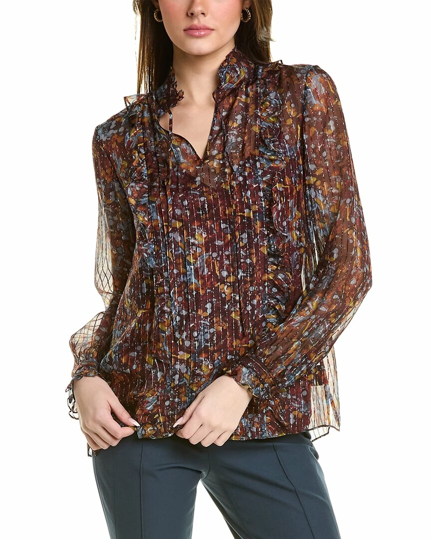 - Harlan Blouse in antique ruby multicolor with mock collar, ruffled trim, blouson sleeves, and button cuffs