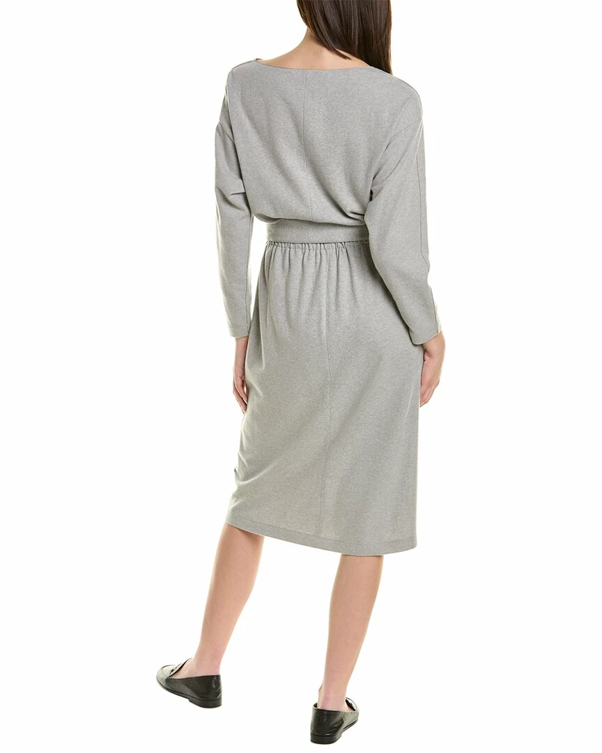 - Harrison Wool & Cashmere-Blend Sweaterdress in grey heather with dropped-shoulder sleeves, elasticized waistband, and self-tie sash at waist