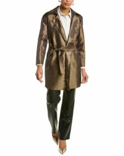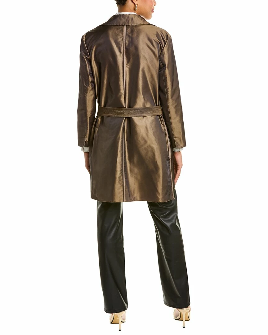 - Hunter Topper in chestnut iridescent with layered notch lapel, 3/4-length sleeves, vented cuffs, dual side on-seam pockets, and self-tie sash at waist