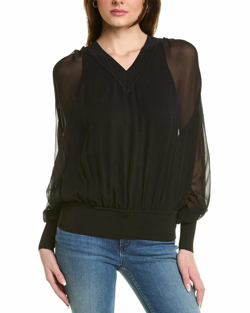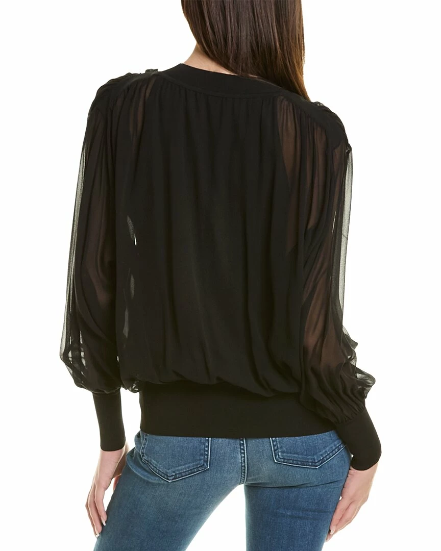 - Ives Silk Blouse in black with V-neck, shirred shoulders, blouson sleeves, and ribbed trim