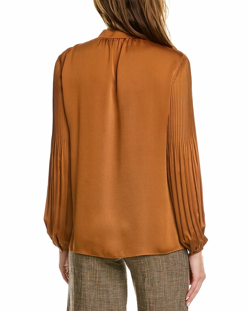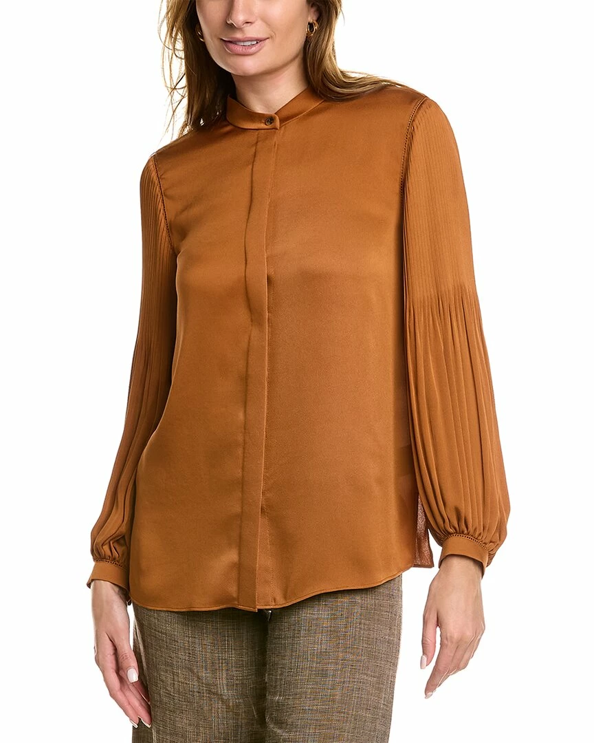 - Layla Blouse in bourbon with mandarin collar, pleated blouson sleeves, and button cuffs