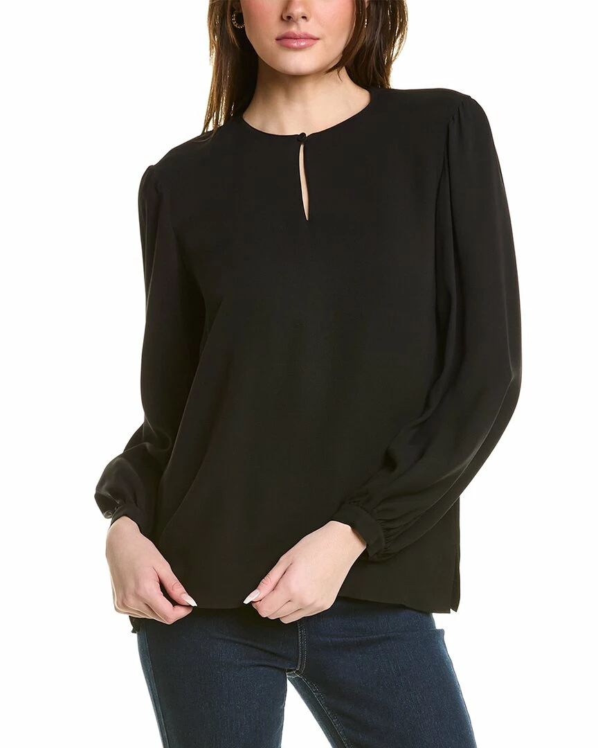 - Layton Silk Blouse in black with blouson sleeves, button cuffs, and side slits at seams