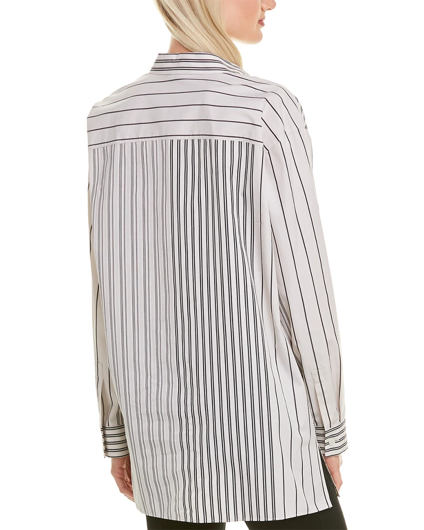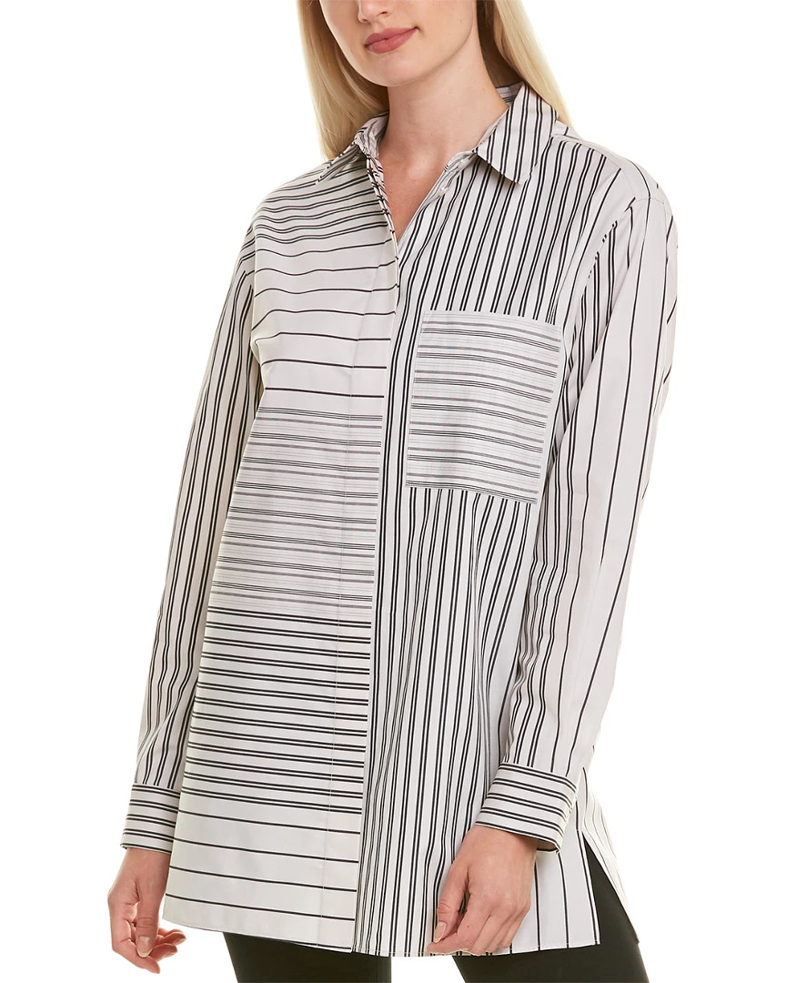 - Maston Blouse in cloud multicolor with mixed stripe design, spread collar, left chest pocket, and button cuffs