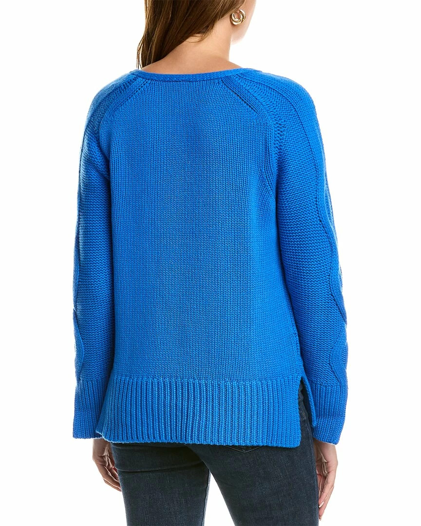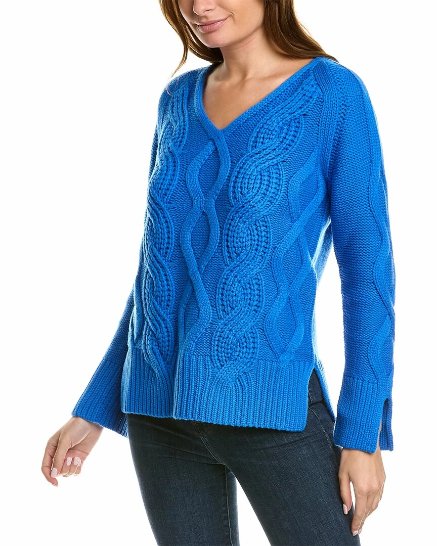 - Mixed Cable Cashmere Sweater in ultramarine with V-neck, ribbed trim, and side slits at seams