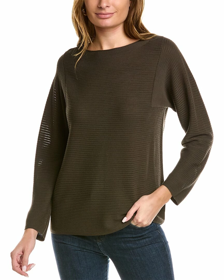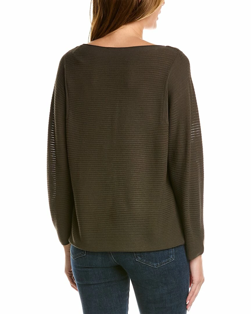 - Ottoman Stitch Sweater in olive with sheer ribbed knit stripe design, boatneck, and dolman sleeves