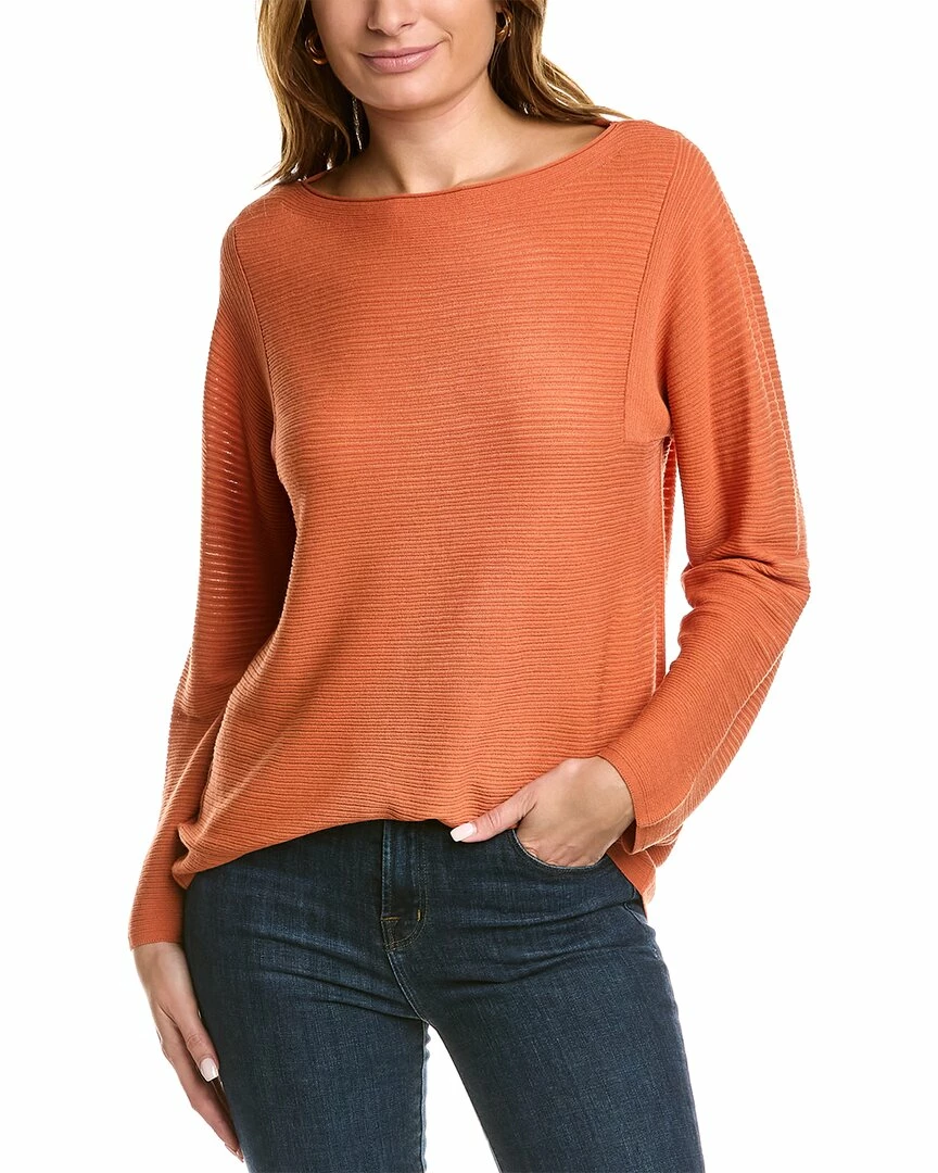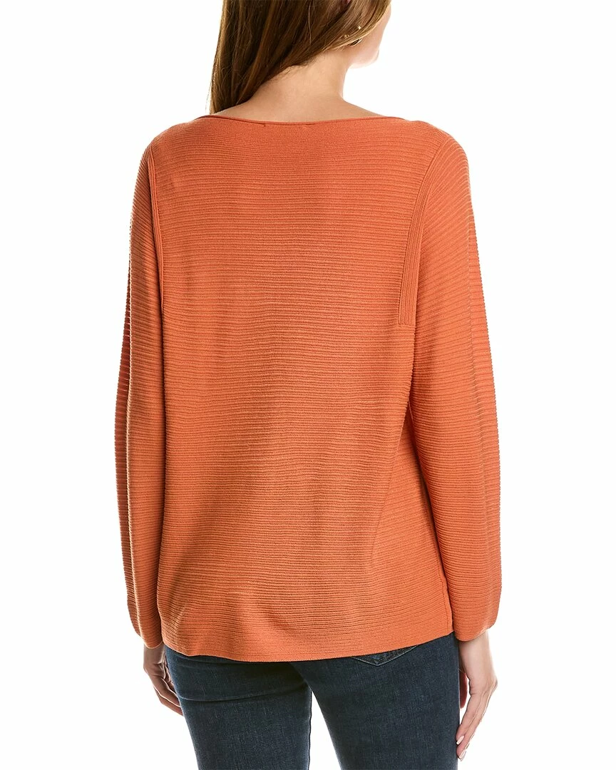 - Ottoman Stitch Sweater in tangerine with sheer ribbed knit stripe design, boatneck, and dolman sleeves