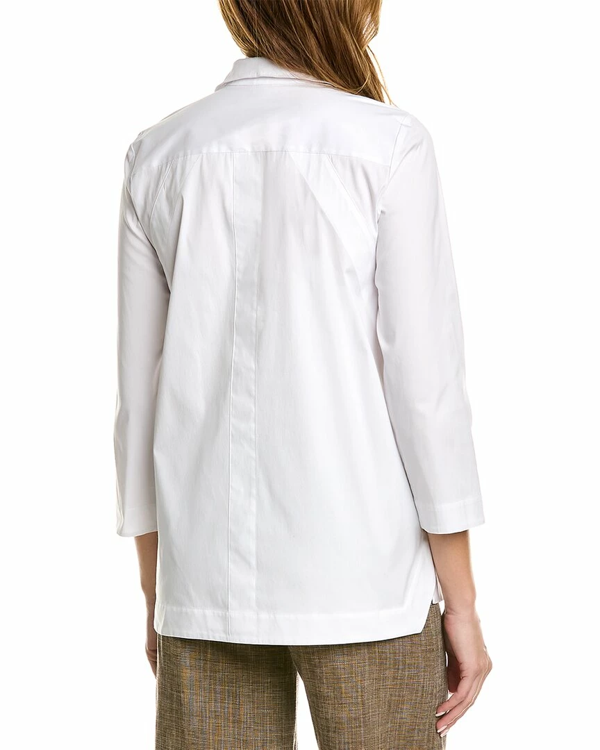- Petite Marla Blouse in white with spread collar, 3/4-length sleeves, and envelope waist