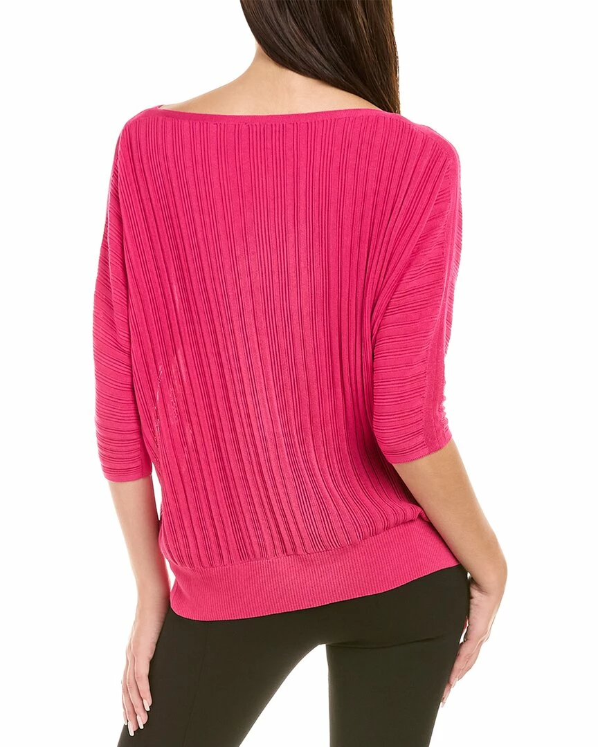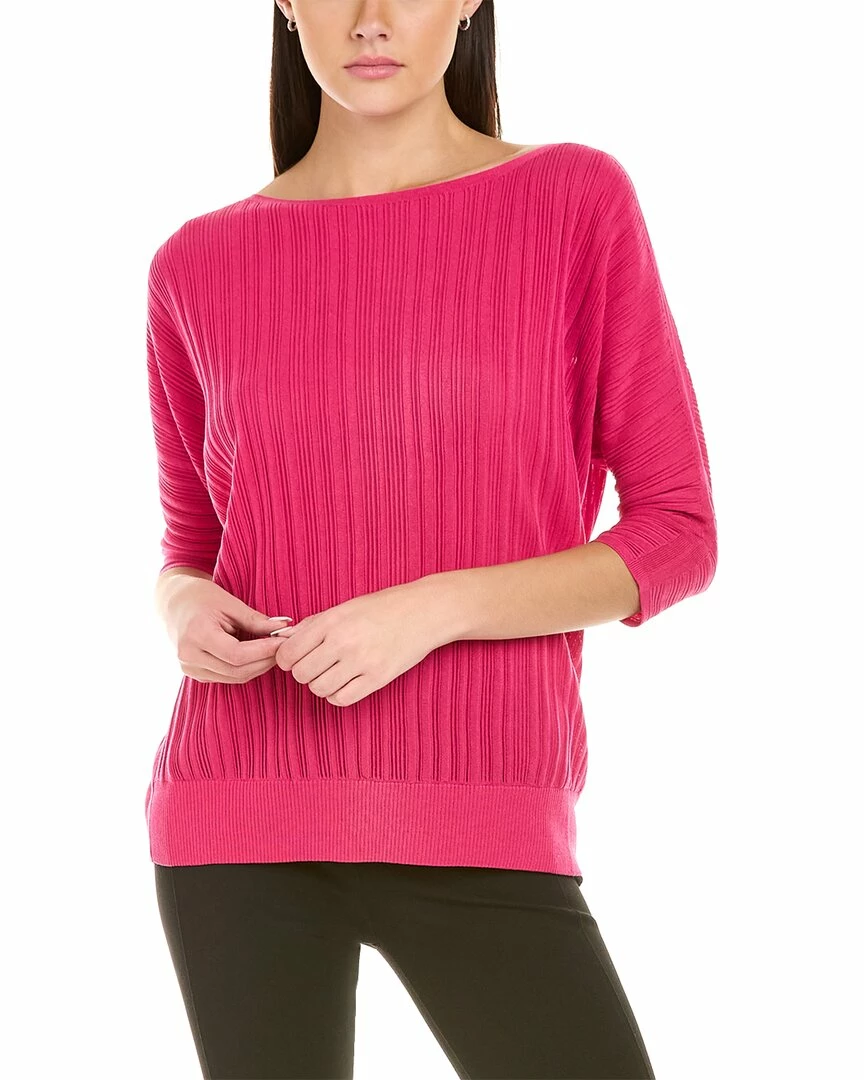 - Plisse Sweater in orchid pink with ribbed knit design, boatneck, 3/4-length sleeves
