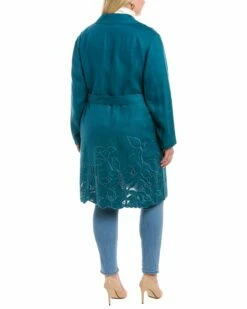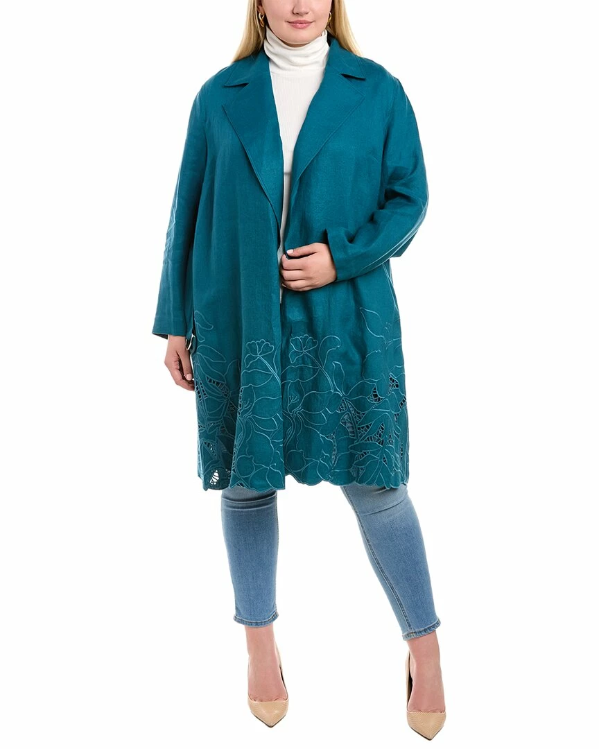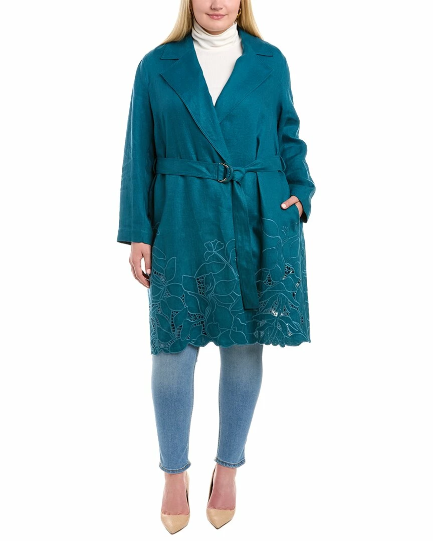 - Plus Liliana Linen Trench Coat in deep lagoon with notch lapel, dual side on-seam pockets, and cutout lace hem