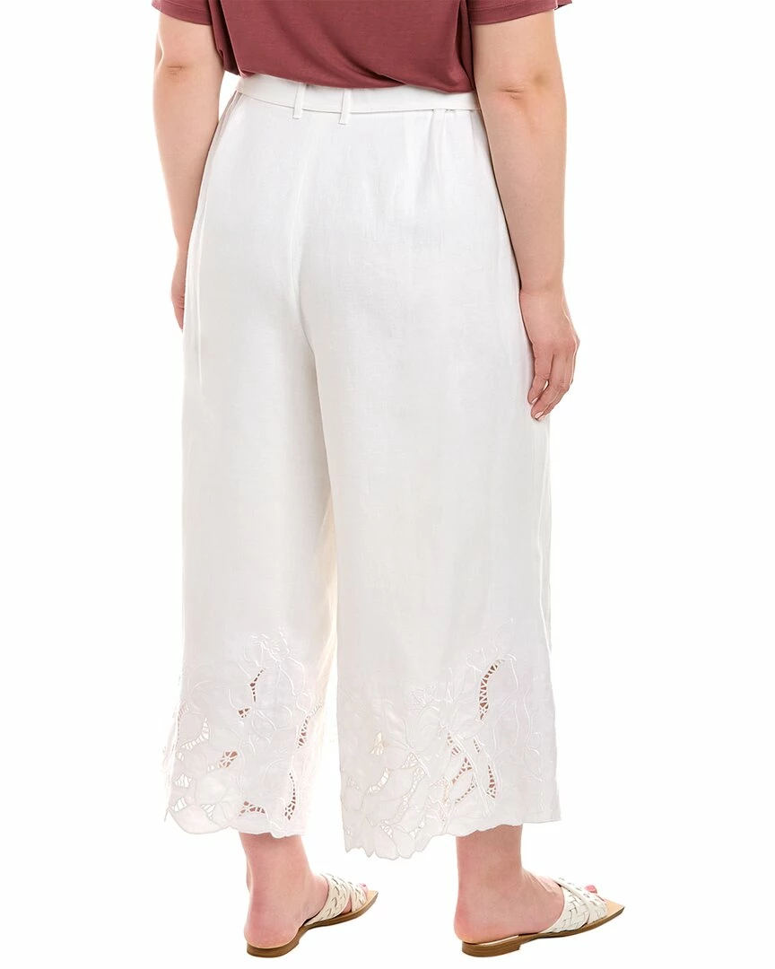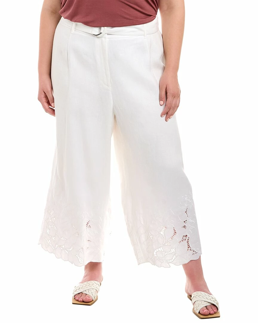 - Plus Rockefeller Linen Pant in white with cutout lace hem, dual side on-seam pockets, and D-ring belted waist