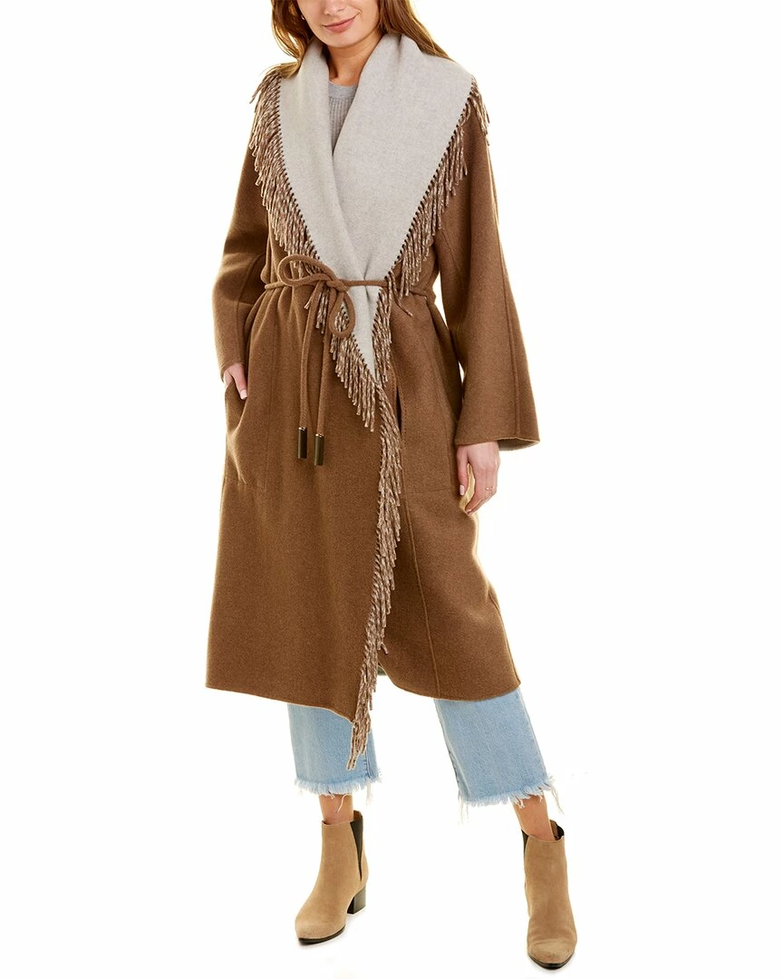- Reversible Everett Cashmere Coat in tobacco melange & grey heather with reversible design, fringe-trim shawl lapel, exposed seams, dual side on-seam pockets, and self-tie cord at waist