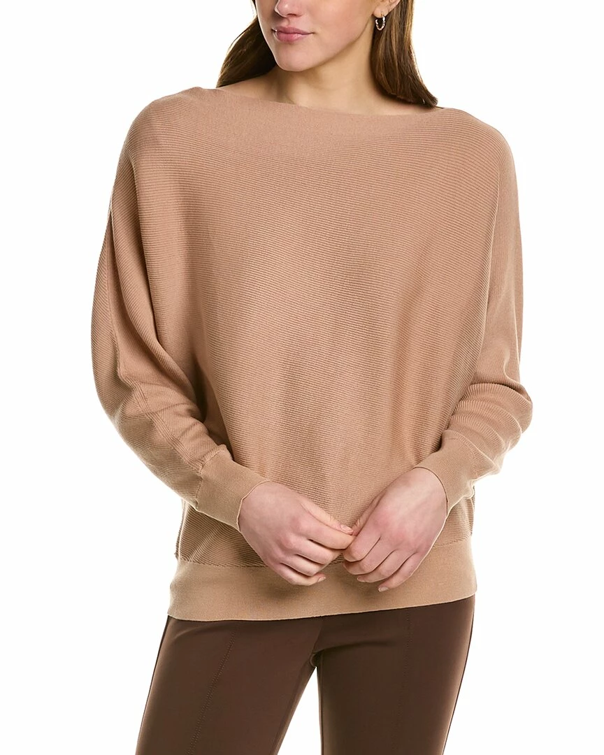 - Ribbed Asymmetric Silk-Blend Sweater in clay with ribbed design, asymmetrical neckline and dolman sleeves