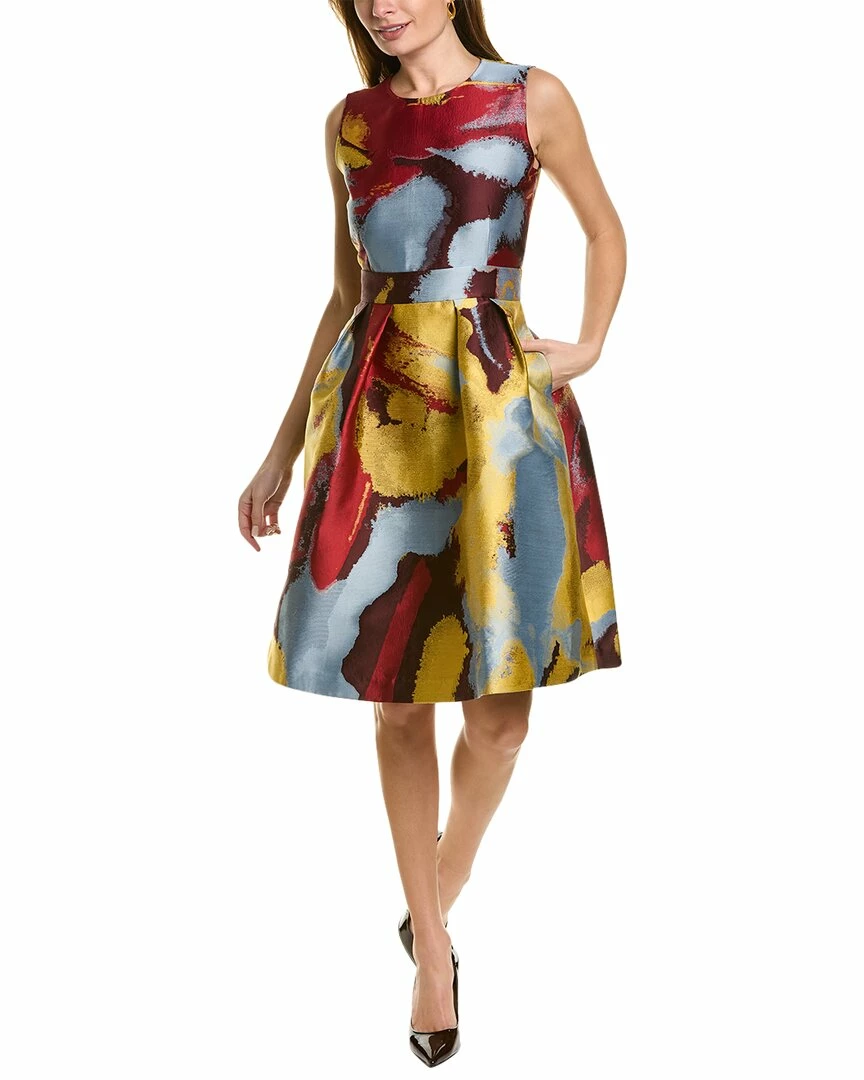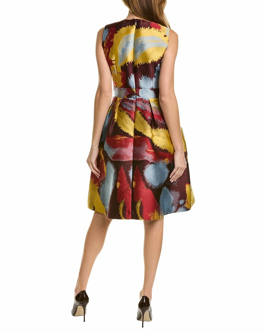 - Rory Silk-Blend A-Line Dress in antique ruby multi with pleated waist and dual side on-seam pockets