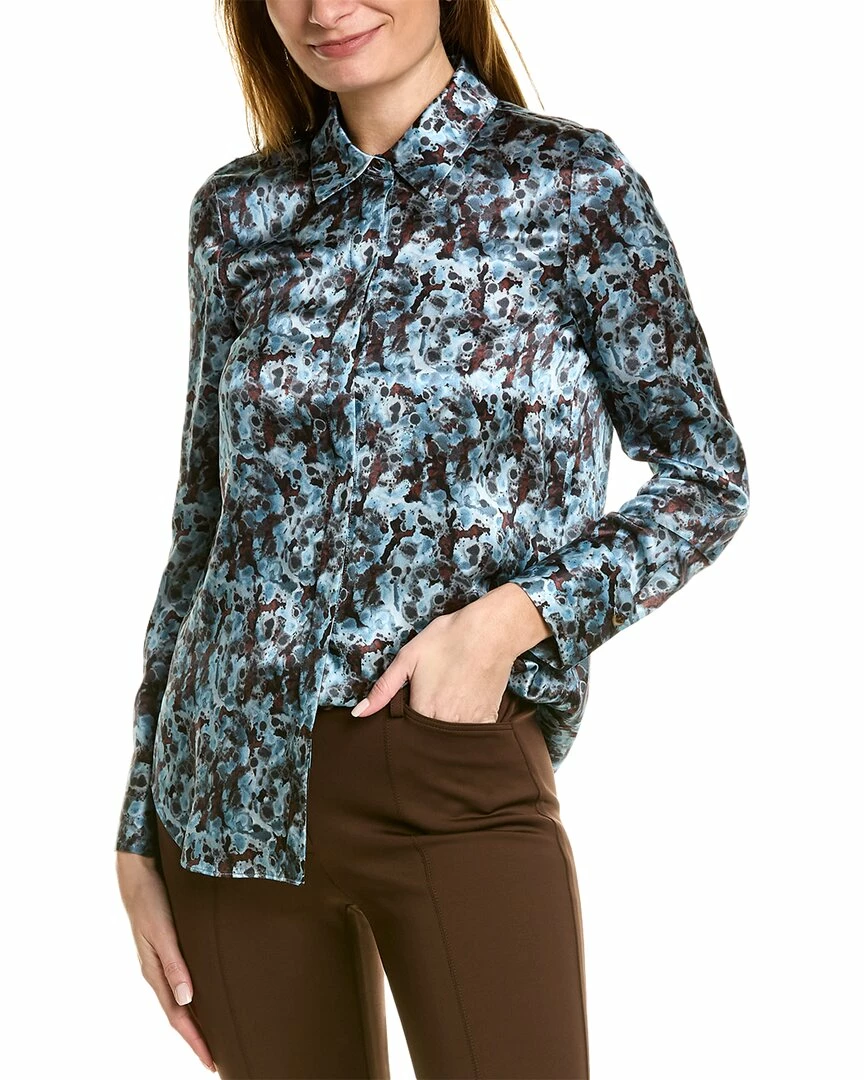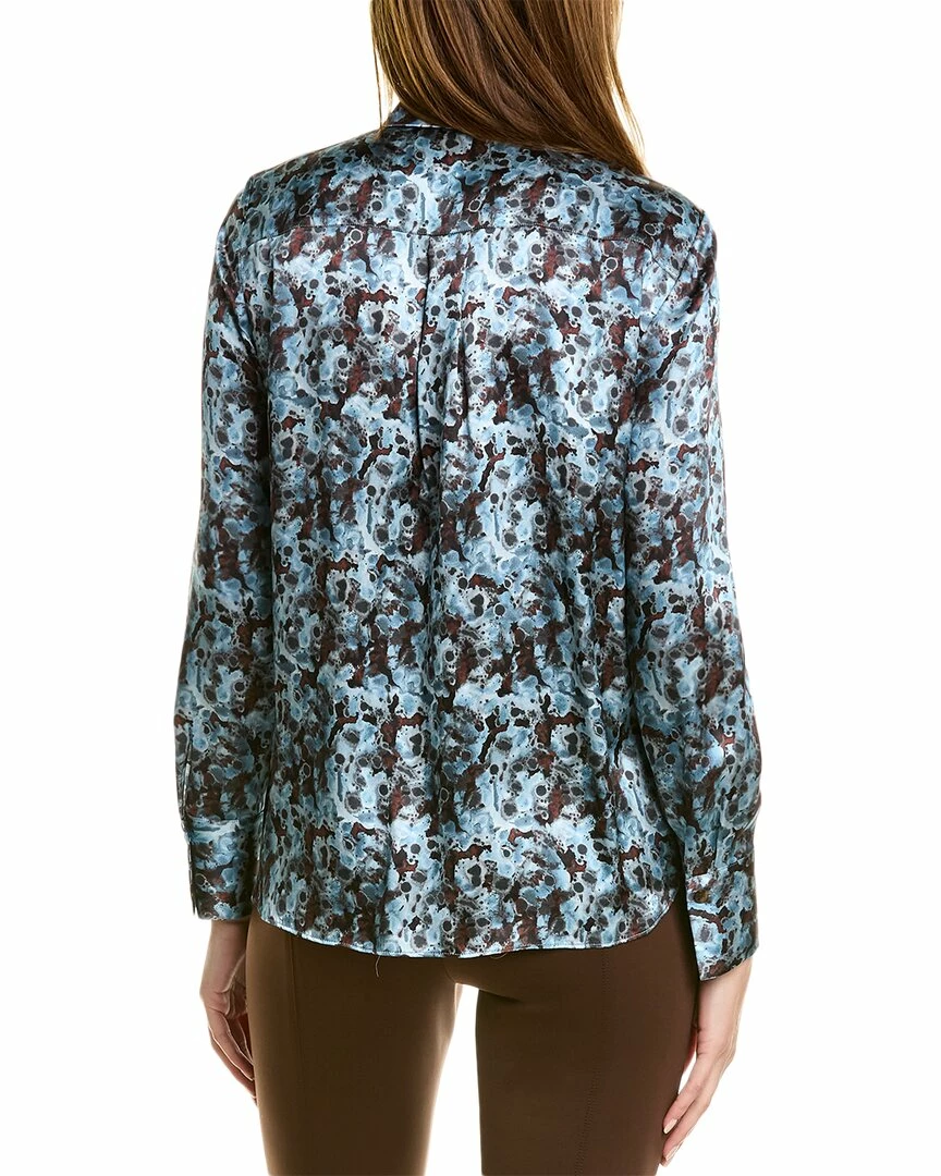 - Scottie Silk Blouse in smoked slate multicolor with spread collar and button cuffs