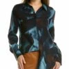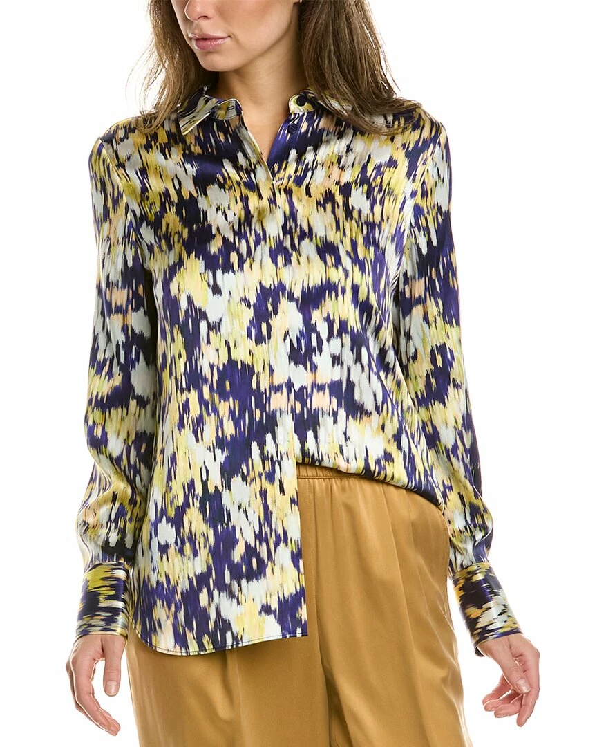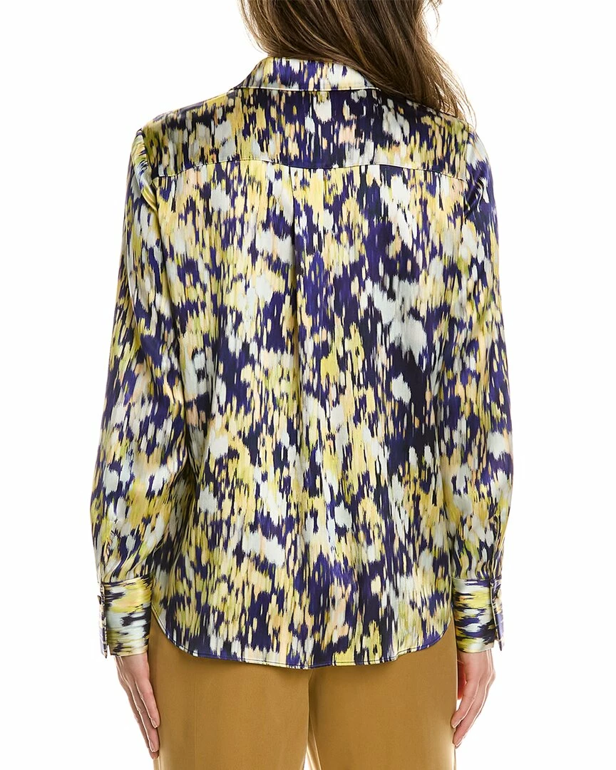 - Scottie Wool & Silk-Blend Blouse in ink multicolor with spread collar and button cuffs