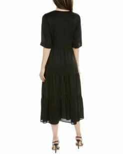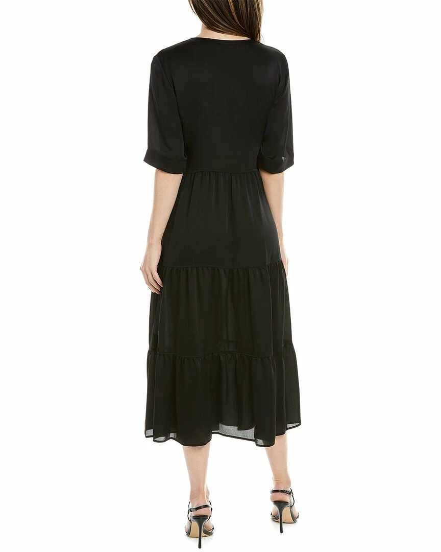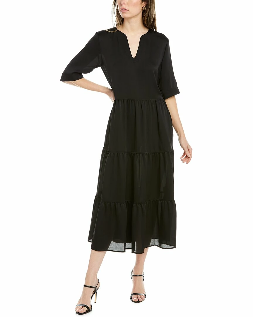 - Selma Dress in black with split neck, tiered skirt, and dual side on-seam pockets