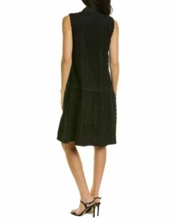 - Serena Shirtdress in black with circle crocheted design, spread collar, and drop waist