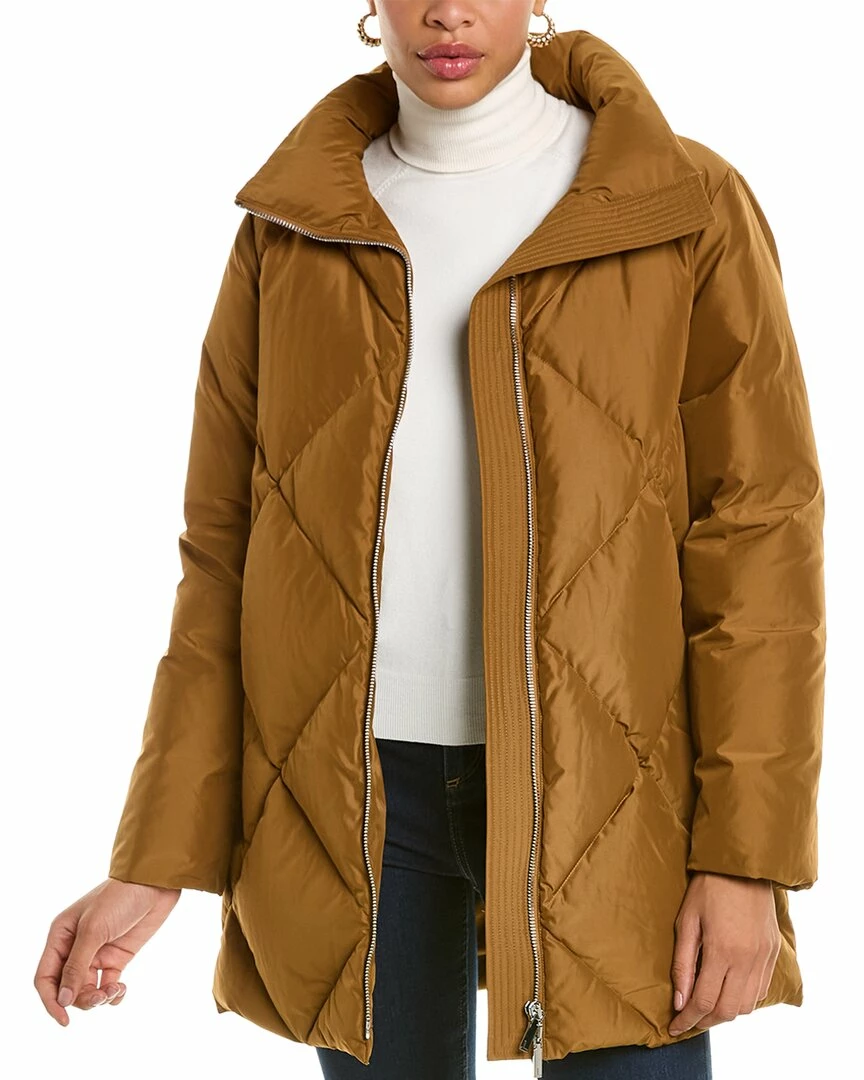 - Simmons Down Coat in clove with quilted design, mock neck, and dual front pockets