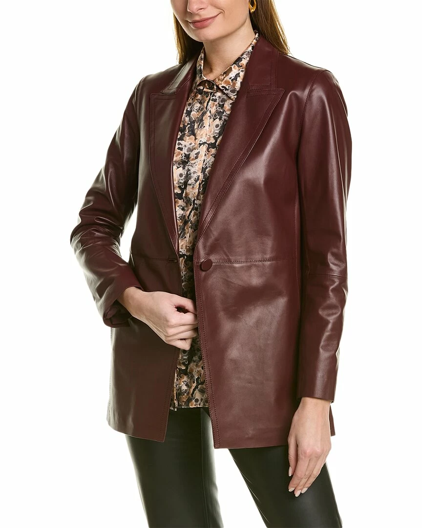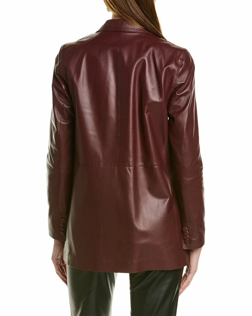- Steele Leather Blazer in deep antique ruby with peak lapel, dual side on-seam pockets, and button cuffs