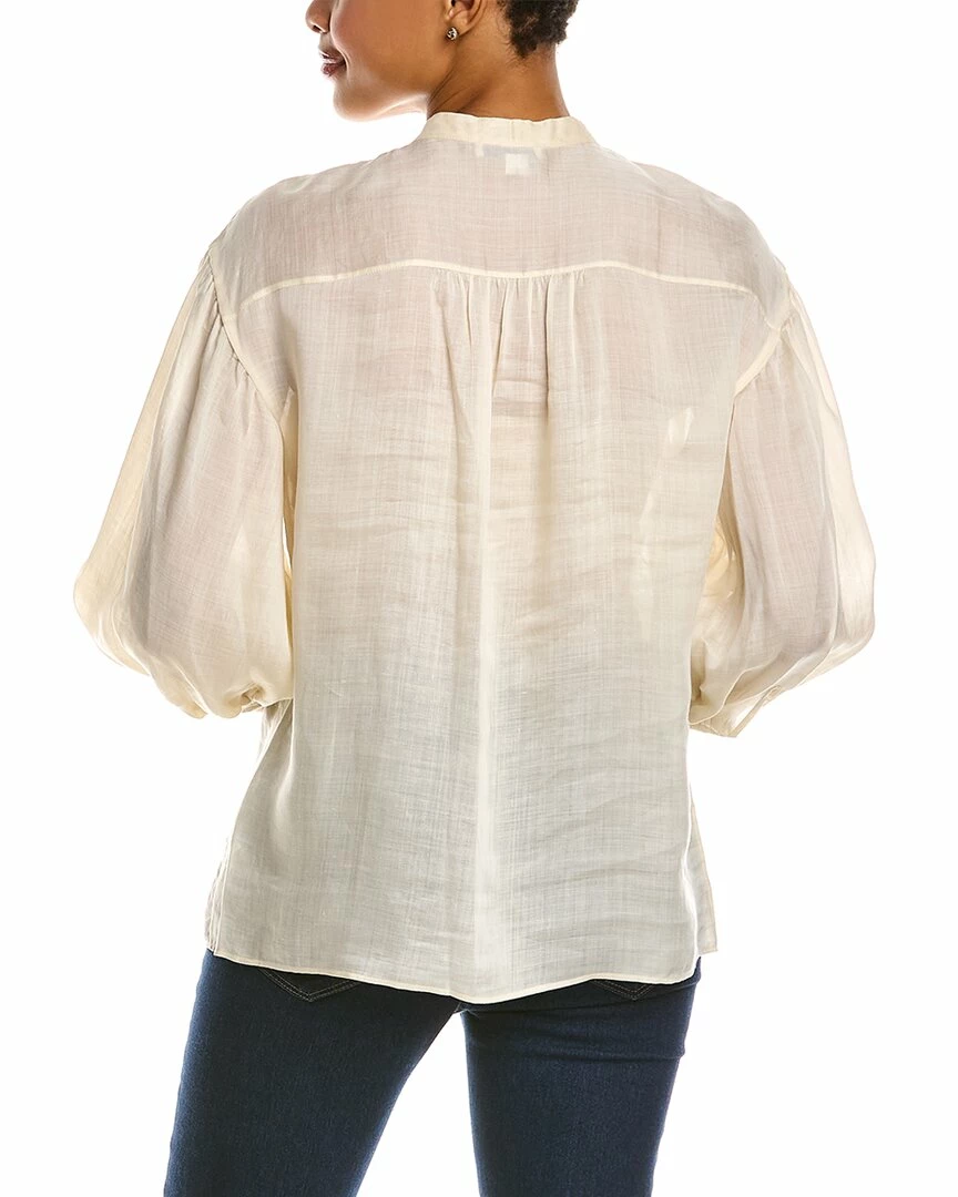- Sustainable Shirt in creme fraiche with pleated front, mandarin collar, elbow sleeves, and button cuffs