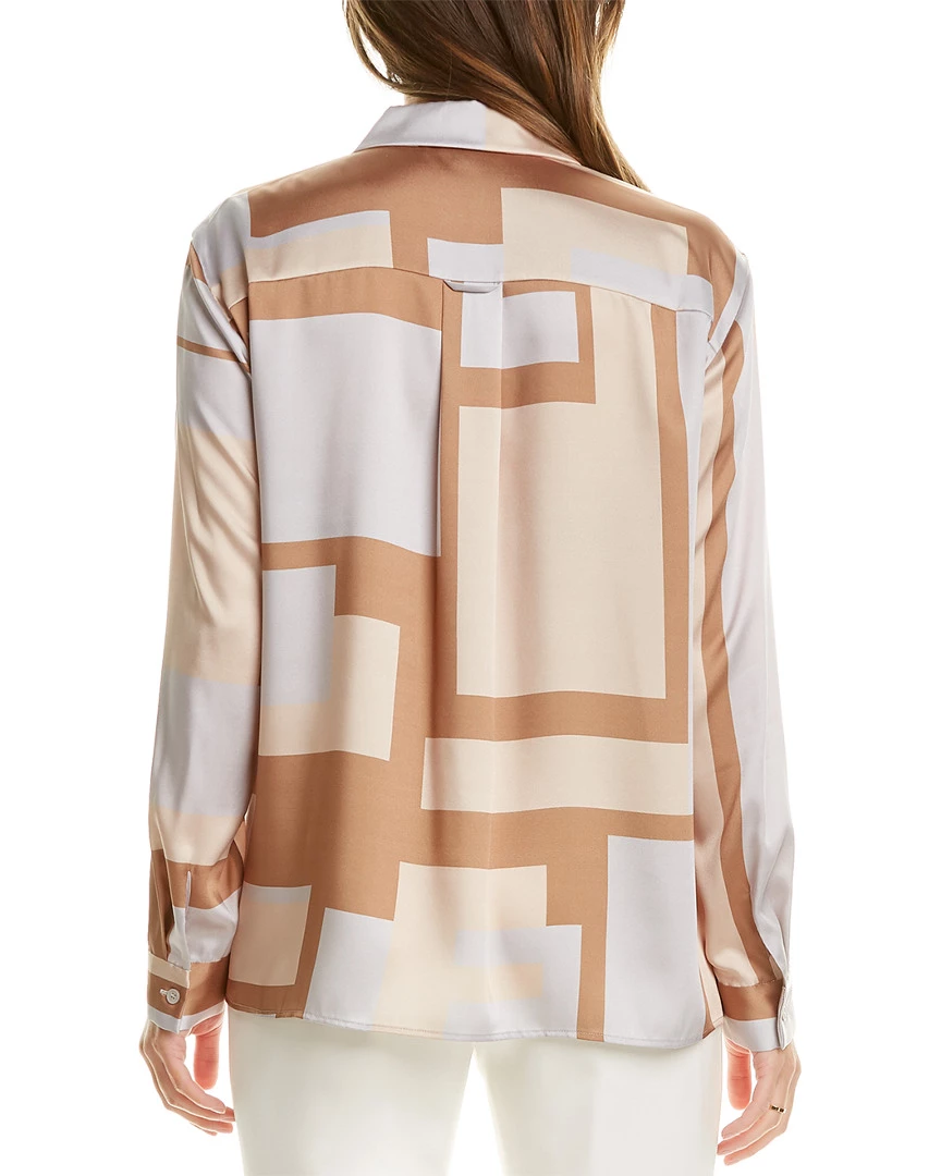 - Zora Blouse in stucco multicolor with pointed collar, barrel cuffs, and box pleat at back